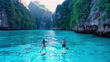 Tropical Vacation Activities :Aerial view of nice day,Young couple in love kayaking on sea together on a tropical climate.Holidays, Summer, Relaxation, Luxury, Pleasure, Happiness, Fun, Wonderlust, Adventure, Experience, Trip, Holidays, Togetherness, Relaxation, Love, Escape, Drone Point Of View, Moving Activity, Busy, Progress, Vitality concept.