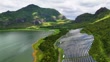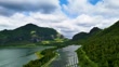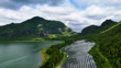 Aerial view of solar power plant located between lake and forested hills - 4K stock video