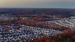 Upward aerial tilt revealing a whole community of white residential tract housing in Burlington, North Carolina.