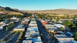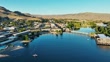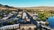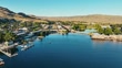Warm summer sunlight washes over historic downtown Lake Chelan in Washington state, USA. Drone point of view.