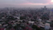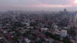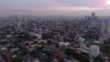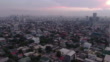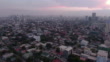 Wide drone shot at dusk of Metro Manila skyline in the distance with residential area in foreground during Covid-19 lockdown. Beautiful pink clouds in the sky.