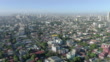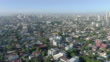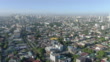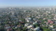 Wide drone shot of Metro Manila skyline with residential area in foreground and central business district in background during Covid-19 lockdown. Shot mid-morning.