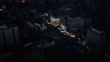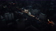 Aerials of Times Square in Manhattan at night, neon signs, theater marquees, and advertisements including Canadian Club whiskey, Coca-Cola, Toshiba, Castro, The Bible at Loew's on State; automobile traffic on streets, pedestrians walking on sidewalks. VO by actor Burgess Meredith.