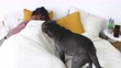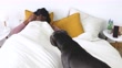 African american young woman playing on bed calls her dog to come. - 4K stock video