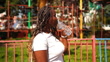 black girl drinks water from a bottle on a summer walk