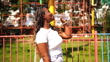 black girl drinks water from a bottle on a summer walk