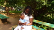 African mother using smartphone with child while sitting on a bench on the street in summer - HD stock video