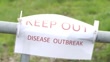 Agriculture / Farming: Anthrax discovered in a cow in Wiltshire; ENGLAND: Wiltshire: Westbury: Dilton Marsh:EXT'Keep Out' sign and cordon tape blocking style on public footpath (running through field near farm where cow discovered with anthrax)'Keep OUt - Disease Outbreak' sign on farm gate'Public Footpat sign PAN to closed-off style and footpathClose shot of Wiltshire Council 'Closure of Footpath' sign