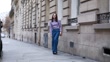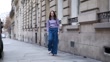 PARIS, FRANCE - DECEMBER 15: (SLOW-MO) Alba Garavito Torre wears a maxi ruffled Peter Pan collar with rick-rack & deadstock vintage trim, in purple gingham shirt from Gingham Palace, wide turned up jeans denim pants from Gingham Palace, brown and white Leather slingback moccasins with heels from Miu Miu, a beige Chanel 19 bag, during a street style fashion photo session, on December 15, 2023 in Paris, France. (Footage by Edward Berthelot/Getty Images)