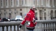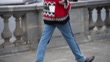 PARIS, FRANCE - FEBRUARY 02: Alejandro Acero wears brown sunglasses, a white t-shirt, a blue denim jacket, a red oversized wool knit cardigan with printed patterns and stars, and turtleneck collar from Zadig & Voltaire, blue denim jeans / pants with long patchwork, burgundy shiny leather pointed shoes with heels, during a street style fashion photo session, on February 02, 2022 in Paris, France. (Footage by Edward Berthelot/Getty Images)