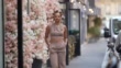PARIS, FRANCE - MARCH 23: (SLOW-MO) Alicia Aylies wears a gold large face print pattern pendant earring, gold rings in the hair, a brown cropped tank-top, matching high waist brown wide legs pants, gold bracelets, white leather and brown logo Stan Smith sneakers from Adidas , during a street style fashion photo session, on March 23, 2022 in Paris, France. (Footage by Edward Berthelot/Getty Images)
