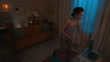 Motivated young woman doing cardio exercises using a rubber band and taking a short break to drink water. She is doing her workout in the living room during the night. Slow motion scene.