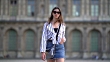 Amanda Derhy wears a Misguided striped top, a Primark blue denim skirt, a Coach silver bag, Adidas Stan Smith white sneakers shoes, on May 27, 2018 in Paris, France.