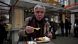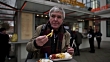 An active senior man enjoys an original Berlin Currywurst - HD stock video