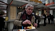 An active senior man enjoys an original Berlin Currywurst with french fries, mayonnaise and ketchup. Particularly beautiful ambience of a typical Berlin food stall on a cold winter day. Winter mood. It������s cold outside.