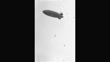 an airship, Zeppelin in the air is flying around, different views from airship, stormy weather, big advertisement of the company Underberg