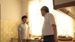 An Asian boy helping his grandparents choose Chinese dumplings in the kitchen using chopsticks.