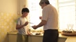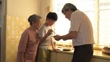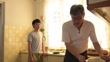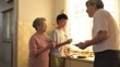 An Asian boy and his grandparents selecting Chinese dumplings together in the kitchen, using chopsticks. - 4K stock video
