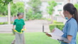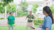 An Asian nurse checks the health of an elderly person while exercising in the front yard. Asian nurse taking care senior at home.