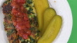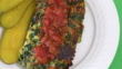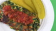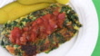 An egg recipe for breakfast. the dish contains spinach leaves, cheese, and spicy hot tomato sauce on top. Directly above view with no people