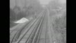 (Jumpy footage) An electric train comes around a bend and rolls past houses then speeds through a station / Two of the trolleys pass each other and an elevated view of a train going underneath / Note: exact day not known