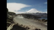 An off-road vehicle is driven through Chile. Includes wide shot of the car travelling along a gravelly road near the dormant, snow-capped volcano Parinacota (Parina Quta, Parinaquta, part of the Payachata mountain chain). Also includes shot of the car travelling along a road in the village Socoroma that once formed part of the historic silver trading route (trail). Chile; 1989. (NESC364S - 329079)
