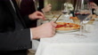 Close-up of hands of business people sitting at the same table in a restaurant and eating different foods