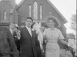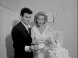 RHONDA FLEMING and LANG JEFFRIES being congratulated outside chapel following wedding ceremony / Rhonda Fleming and Lang Jeffries cuddling cheek to cheek / Rhonda Fleming throwing flower bouquet outside church, caught by older woman, Lang Jeffries smoking cigarette, watching on / Rhonda Fleming and Lang Jeffries cutting wedding cake, serving slice, laughing and smiling / Lang Jeffries kissing the cheek of Rhonda Fleming, both posing for cameras, the newlyweds kiss on the lips. Rhonda Fleming Marries Lang Jeffries on April 04, 1960 in Las Vegas, Nevada (Footage by Getty Images)