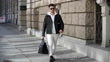 BERLIN, GERMANY - MARCH 08: (SLOW-MO) André Hellmundt walks while wearing black jacket Karl Lagerfeld, white hoody H&M, white jeans SamsoeSamsoe, black boots Arket, sunglasses Saint Laurent and black weekender bag The Kooples on March 08, 2021 in Berlin, Germany. (Footage by Christian Vierig /Getty Images)