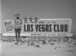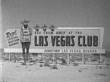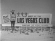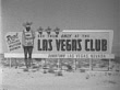 MOT 1952: LAS VEGAS, NEVADA: SIGN: Angled WS Billboard in desert advertising 'Real Lifelike Western Badmen, See Them Only at the Las Vegas Club Downtown...' w/ illustration of man in Western clothing w/ mask over lower face, body of slot machine, inside