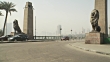Angled XWS Qasr al-Nil (Kasr el-Nil) Bridge w/ two bronze lion statues at end w/ graffiti on bases, cars driving off bridge far lane & out of frame left, street lanes clear FG, city in pollution smog BG.