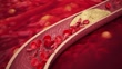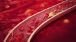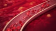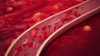 A digital 3D animation depicts red blood cells flowing through a narrowed artery. The arterys lining is thick with plaque buildup, constricting the space available for blood flow. The red blood cells are shown in close-up, emphasizing the impact of the narrowed artery on their movement.