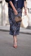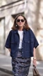 MUNICH, GERMANY - APRIL 16: (SLOW-MO) Annette Weber wears Agolde jeans blouse, TT Stories skirt, Citizens of Humanity tanktop, Saint Laurent pumps, Brunello Cuccinelli bag, Ole Lynggaard necklace and charm, Alaia sunglasses and Falke tights on April 16, 2025 in Munich, Germany. (Footage by Moritz Scholz/Getty Images)