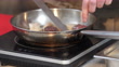 Pouring cooking oil into pan and adding knob of butter. Frying black pudding and white tripe chops until crispy. Using palette knife. Induction burner.
