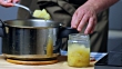 Putting pressure-cooked applesauce in sterilised canning jar. Closing lid.