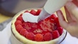 Female hand's applying whipped cream onto the raspberry cake handheld close up