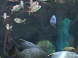 aquarium fish swim by with a noticeably friendly french Angelfish, Blue Chromis, Doctorfish, Surgeon's Scalpel, Blue Tang, and Scrawled filefish.