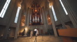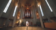 A leftward pan inside HallgrÃmskirkja Cathedral, revealing the towering architecture and the elegant symmetry of its interior. As the camera moves, the focus shifts towards the grand pipe organ, its gleaming metal pipes and intricate wooden structure dominating the frame. The organ’s imposing presence is framed by soaring concrete arches and tall windows that allow soft natural light to filter in. The shot gradually centers, aligning with the doorway beneath the organ, where visitors walk in and out, adding a sense of scale to the vast space.Reykjavik, Capital Region, Iceland - February 06, 2025
