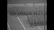 "Army" and "Navy" pennants fly against sky/cloud backdrop / VS midshipmen of US Naval Academy march on field of Memorial Stadium prior to game between Navy Midshipmen and Army Cadets of the US Military Academy / midshipmen line up in formation on field / spectators in stands / VS midshipmen leave field, file into stands / VS cadets march on field / General Dwight Eisenhower applauds as he looks on from stands / rear shot cadets kneel on field / WS cadets stand, cheer / VS groups of cadets run off field / WS crowd in stands / Army pass / slo-mo Army player carries ball, scores / CU happy cadets / VS Army's Rip Rowan runs 92 yards for touchdown / CU cadets cheer / Army teammates cheer on sideline / Army intercepts pass, scores / excited fan jumps on sidelines / crowd swarms field