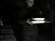 MOT 1937: BRITISH ROYAL ARMY: Army cooks walking in line wearing kitchen uniforms, hats, holding pots of food. Soldiers eating at table. CU Serving spoon scooping food out of casserole dish on table. Soldiers walking w/ trays in mess hall.
