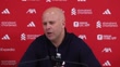 LIVERPOOL, ENGLAND - FEBRUARY 28: Arne Slot, manager of Liverpool, speaks about changing things defensively and offensively and closing the gap with Arsenal after their Premier League match against West Ham during a press conference at Anfield on February 28, 2026 in Liverpool, England. (Footage by Niche Sport Media via Getty Images)