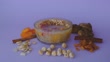 Slow motion Taking from Ashura with a spoon. Around the bowl, there are ashura ingredients such as dried figs, dried apricots, hazelnuts, raisins, cinnamon.