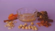 Time lapse shot. A plate of AÅŸure dessert ends with a spoon. There are ashura ingredients around the close-up plate. Cinnamon, apricot, hazelnut, grape, dried fig