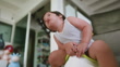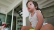 Asian baby boy sitting pooping. on the potty and watching television - 4K stock video