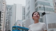 Asian businesswoman exploring the dense urban cityscape during her midday lunch break, in Hong Kong in the Greater Bay Area. Professional lifestyle, city discovery, and a refreshing pause amid a busy workday - 4K stock video