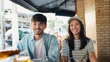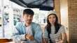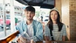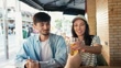 Asian tourist couple and friend tasting Brazilian typical food in the bar - 4K stock video