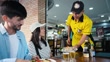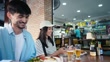 Asian tourist couple and friend tasting Brazilian typical food in the bar