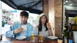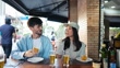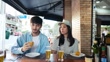 Asian tourist couple and friend tasting Brazilian typical food in the bar - 4K stock video