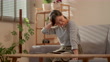 Asian woman feels pain from injury neck sitting on sofa in living room at home. - 4K stock video