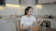 Asian woman in pajamas who has a sore throat was eating chicken soup to relieve a sore throat and video call with her friend in table in kitchen at home - 4K stock video